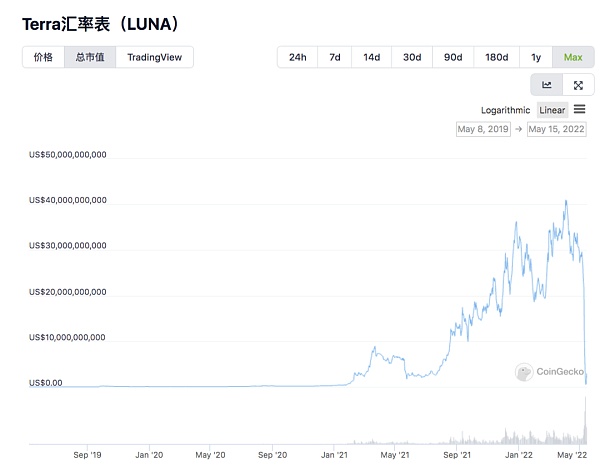 LUNA幣在虛擬貨幣市場中的地位舉足輕重,其流通市值一度在虛擬貨幣市場排名前五。今年4月份,其價格達到116美元高點,總市值超410億美元,與平安銀行市值接近。?