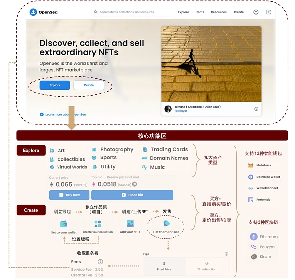OpenSea是對接NFT市場買賣方的交易平臺。買方和賣方分別對應OpenSea主界面的創造(Create)和探索(Explore)兩大基本功能。賣方完成創造并成功售出NFT,要經歷建立NFT項目集、創建或上傳NFT及選擇售賣三個步驟,并進行銷售版稅、定價方式的設置;買方通過探索功能,可以瀏覽平臺上的NFT資產,若搜尋到心儀產品,即可根據不同的售賣方式支付價款或發出競價。在這過程中,平臺方通過增加所支持的錢包和區塊鏈數量、提高上鏈資產體量和拓展資產類型等手段,承擔著實現交易便利最大化的職能,打造聚合市場。
