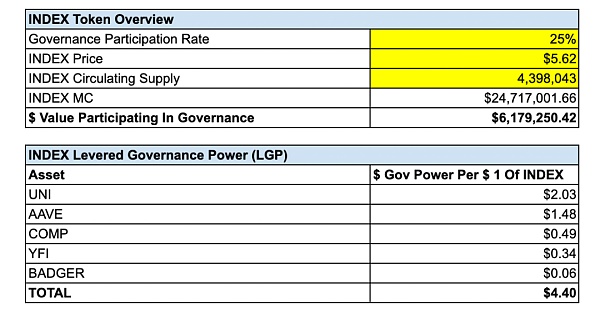 現在,讓我們計算一下每 1 美元的 INDEX 在治理中潛在的最大杠桿治理能力。