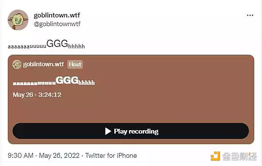 自項目售罄后,Gobilintown 項目方通過官方社媒、Twitter Space 等渠道,展開了對哥布林語的傳播。據觀測,26 日的線上討論總時長達三個半小時,最高同時收聽人數達 1700 余人。有趣的是,每位持有者發言人都融入了對哥布林角色扮演身份的氛圍,并樂在其中。
