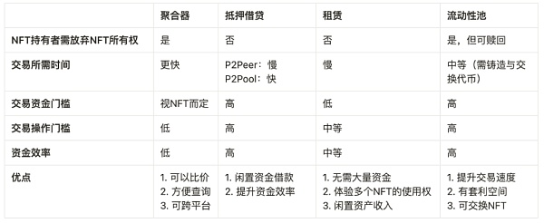 目前,大部分用戶集中在操作門檻最低的市場與聚合器領域,然而這兩個領域并未完全展現出最大的資金效率。而從操作門檻分析,待更多的用戶加入 NFT 領域,可以預測下一輪市場熱點將集中在 NFT 租賃領域。操作門檻較高的借貸與流動池項目雖然能有效地提升資金效率,然而該如何吸引用戶的目光,讓用戶感受到這些功能的重要性,是項目需要仔細斟酌的方向。