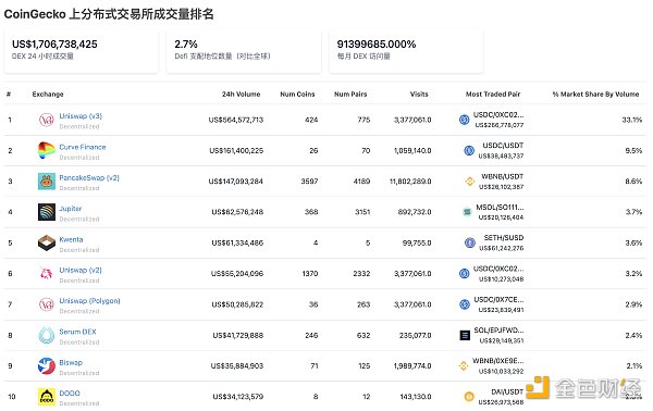 過去24小時去中心化交易所的交易量 數據來源:coingecko