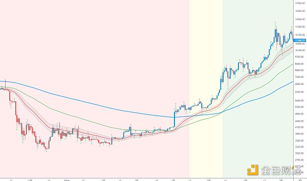 BTC周線自前期5月初有效跌穿圖中黑線支撐38000便一路下滑,中間跌速過快便階段性反彈反抽或者區間震蕩等待紅線下壓后繼續下滑,最終插針至17600止跌回升展開區間震蕩,這兩個多月BTC周線一直被紅線壓制,而上周反彈陽線重新站上,預示著前期大級別單邊下跌行情有機會終結,并且下方周線上行通道和前頂下降通道下軌線交叉于此處,這波大跌并未有效跌破,當然這一帶還有其余長期支撐,前期文章都分析過,不破后面就有再次震蕩筑底機會,不過目前短期紅線依舊是下滑狀態,后面拐頭向上才有望發動較長周期行情,所以后面一段時間將可能維持區間震蕩等待均線拐頭,蓄力后展開大級別反彈,向前看的話這種例子很多,所以目前需要的可能就是耐心,下方周線支撐19000。