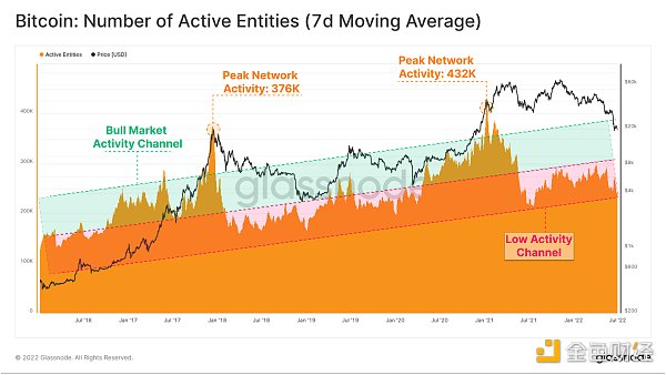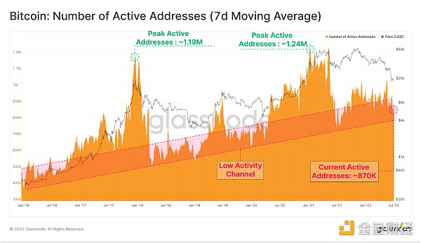 由于美國6月份通脹預期仍居高不下,烏云籠罩,潛在的經濟持續衰退,市場仍處于高度避險狀態。這在比特幣的鏈上表現和活躍度中很明顯,最近幾周比特幣的鏈上活躍略有減弱。隨著網絡活躍現在處于與2018年和2019年最嚴重的熊市階段相吻合的水平,似乎已經發生了對市場旅游近乎徹底清除的情況。