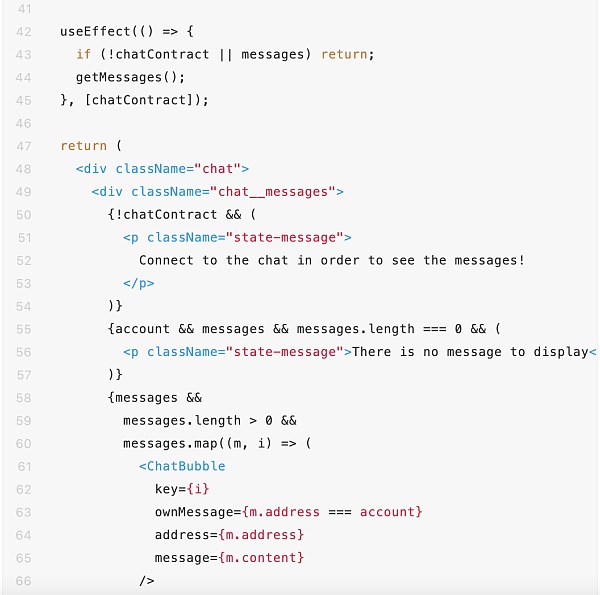 現在我們已經在前端實例化了智能合約,我們終于可以獲取消息了。打開Chat.tsx并添加以下getMessages函數: