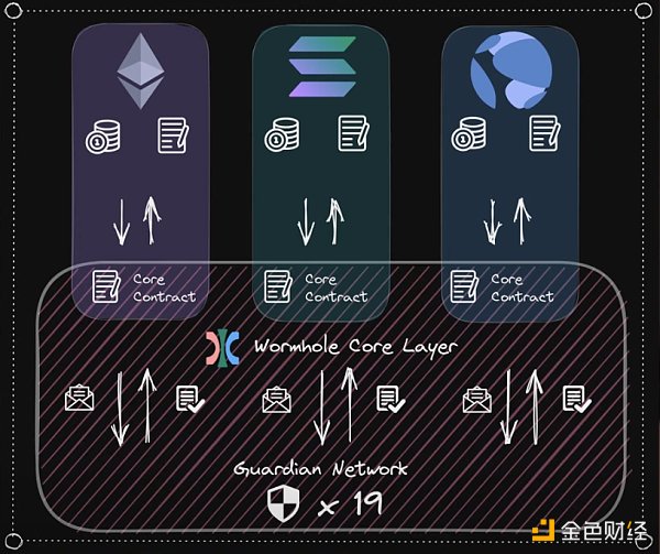 Wormhole 由部署在每個鏈上的核心合約和守護者(Guardian)網絡組成的。