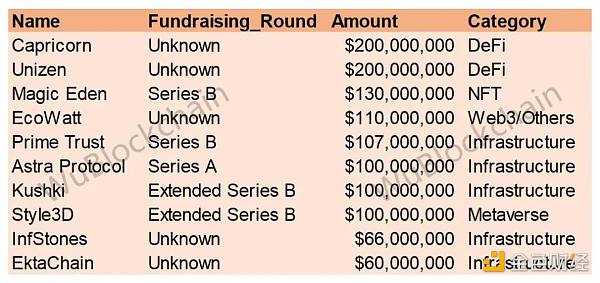 本月各領域融資數量比較均衡,CeFi、DeFi 與 NFT/GameFi 領域各占約 20%。其中 CeFi 融資金額較大,原因是有大量機構為避免被清算進行了債務融資,例如 BlockFi 從 FTX 融資了 2.5 億美元,以及 Voyager Digital 從 Alameda 融資 2 億美元。