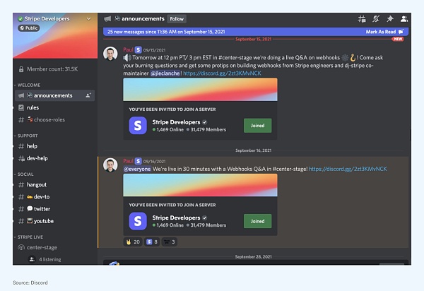 新成員到來時是否由真人(而非機器人)迎接,并且引導ta們加入對話?Discord 上的 Stripe’s developer community 為我們展示了二者的巧妙結合:他們同時運用機器人和開發者公關團隊來迎新。