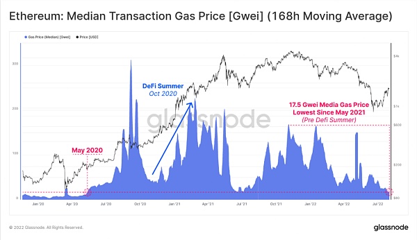 以太坊Gas費用的7天價格中位數最近跌至僅17.5 Gwei。這是自2020年5月(即 DeFi Summer 以及上一輪的牛市開始之前)以來的最低網絡擁塞和Gas價格。
