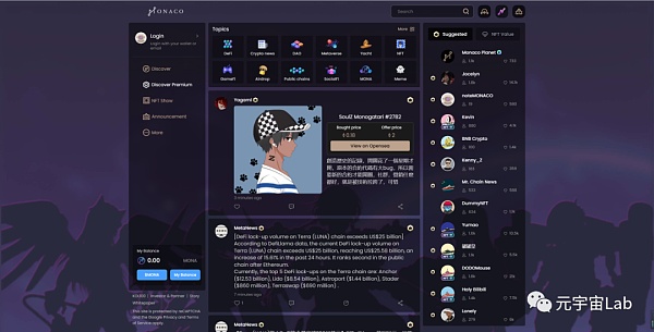 Monaco Planet通過要求通過MetaMask等錢包登錄來解決垃圾郵件發送者和詐騙者的問題。當用戶在他們的個人資料頁面上展示他們的 NFT 收藏時,可以通過他們的參與度和奉獻精神來識別真正的影響者。發布和展示其活動的用戶可以在整個社區中關注經過驗證的 KOL。該平臺還可以根據用戶的凈資產和NFT的影響力對用戶進行排名,促進KOL和用戶之間的有機聯系。