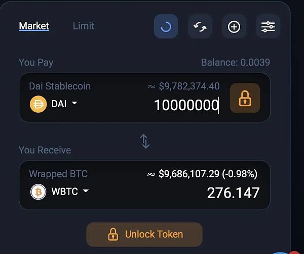 比如我想要用DAI穩定幣購買wBTC,交易金額為1000萬美元,那么顯示可獲得的wBTC數量大約為282.06 BTC。