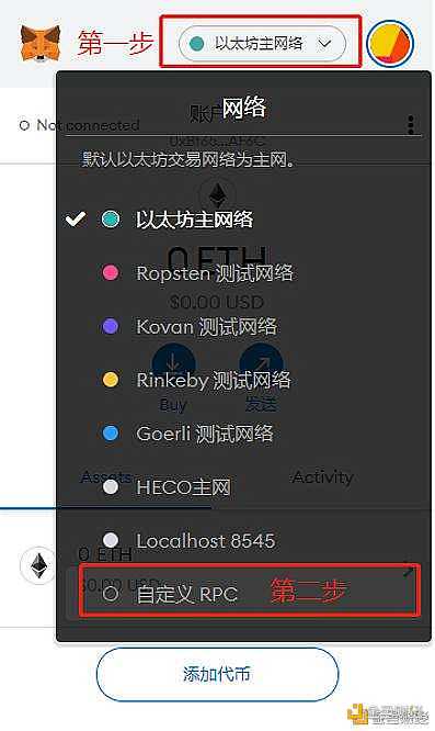 (1)打開MetaMask,可以看到錢包被默認設置成[以太坊主網]。點擊[以太坊主網],在下拉菜單中點擊[自定義RPC]。