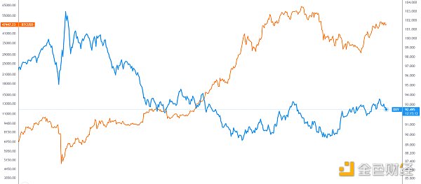 如圖所示,黃色線比特幣走勢,藍色線美元指數走勢,去年312開始,BTC啟動牛市,不僅V形反轉后面更是一路高歌,從3800美金一路漲至當前最高64850美金再大幅回撤至30000美金一帶,近期迎來了強勢反彈,同期去年3月開始,疫情原因全球放水,美元指數進入下跌周期,從103高位下跌至89附近止跌回升,這一段兩者走勢基本呈現負相關。