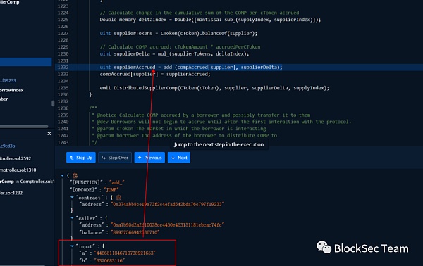 其Claim大量的COMP代幣,通過調試我們發現,在調用distribute時: