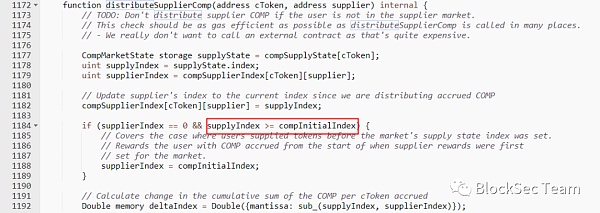 最新的合約里,distributeSupplierComp函數中初始化用戶獎勵指數的判斷條件修改如下: