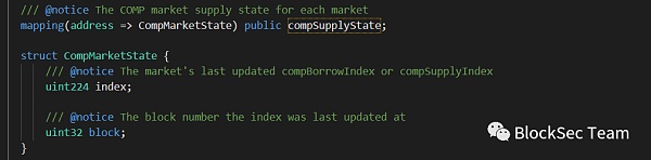 很顯然,合約會走到?else if (compSpeed != 0)?這個分支。我們來看這個分支中有兩個if判斷(以第一個為例):if (compSupplyState[address(cToken)].index == 0 && compSupplyState[address(cToken)].block == 0)。其作用是:為一個未初始化的市場,初始化獎勵指數(index)和區塊號(block)