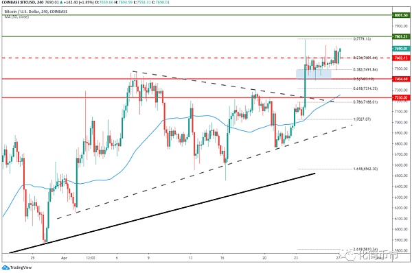 隨著短線高位橫盤行情的走出,目前BTC 4小時50周期均線抬升的腳步明顯加速,截至發文時段,目前4小時50周期均線已經上行至7230(前期標記的三角形結構突破口位置)上方,這也讓短期“托底強支撐”的位置明顯上移。加之在最近兩次明顯的回踩試探過程中行情都非常精準地停留在前一輪上漲波段回調0.382黃金分割線對應的7500附近,這也讓該支撐的有效性得到了反復驗證。因此,目前下方不遠處的短期支撐強度相當理想,這為行情進一步走強提供了一個相當理想的環境。