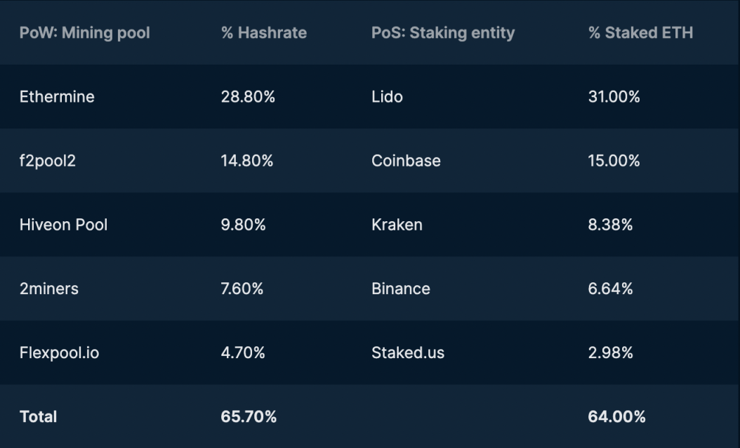 盡管它們在技術上不是一回事,但在比較以太坊的 PoS 與 PoW 中心化時,比較最大礦池的哈希率和最大權益實體或中介機構的權益 ETH 可以作為粗略的指標。 乍一看,兩者在實體級別上似乎幾乎相同(去中心化)——前 3 名合并了一半以上,前 5 名分別占哈希率或 Stake 份額的三分之二左右: