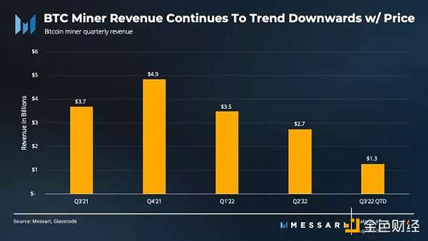 礦工有兩個收入來源:區塊獎勵和交易費用。他們的收入取決于比特幣的價格和對比特幣區塊空間的需求。2021 年第四季度,礦工收入達到 48 億美元的峰值,但此后一直隨著比特幣價格下降。2022 年第一季度和 2022 年第二季度礦工的季度收入分別下降了 28% 和 22%。如果比特幣的價格在第三季度末仍保持區間波動,鑒于能源價格高企,季度礦工收入可能會繼續呈下降趨勢。