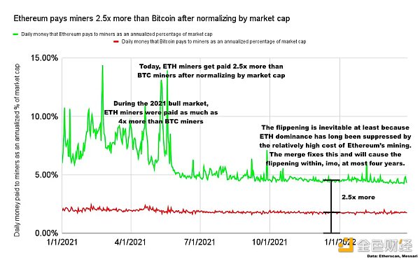 歷史上,ETH 礦工的收入比比特幣礦工高很多。如果兩條鏈的成本結構互換,即如果 BTC 礦工的收入與 ETH 礦工的收入相同(反之亦然),或者如果合并在兩年前就已經準備好了,我認為 the Flippening 可能已經發生了。