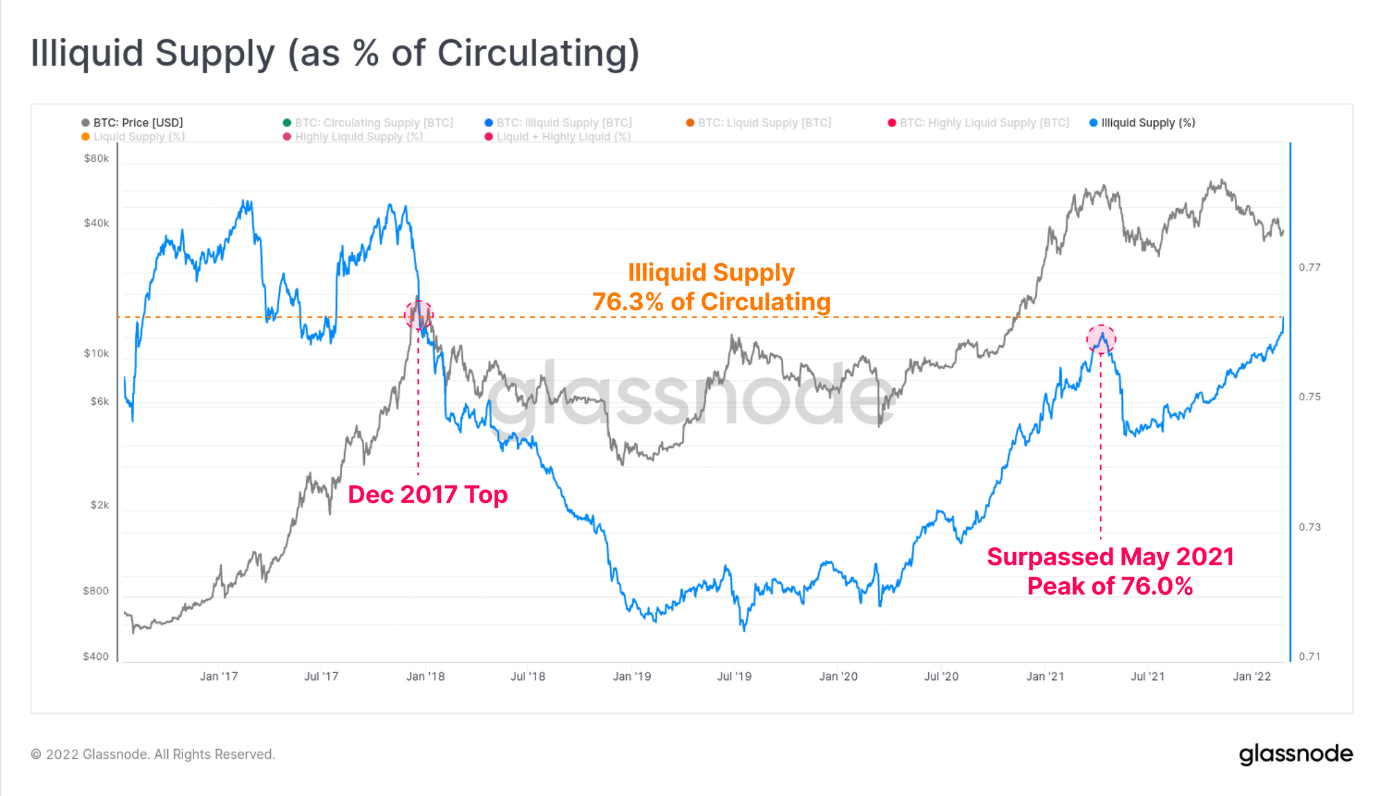 非流動性供給占流通供給的比例已超過2021年5月的峰值,達到76.3%。這現在已經回到了與2017年市場頂部相同的水平,扭轉了長達四年的代幣錢包流動性的增長。然而,請注意,這兩種情況都發生在重大拋售事件之前,因此這些這些代幣是否真的處于冷藏狀態,還有待觀察。