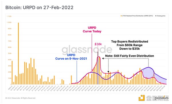 此外,主要的再分配似乎來自于那些在歷史高點附近買入6萬美元以上范圍的投資者,他們已經在當前的3.5萬美元至3.8萬美元的價格區間找到了新的所有者。