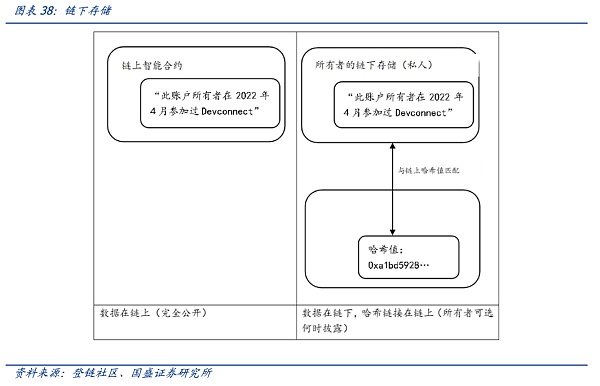 靈魂代幣改變了數字畫像的模式,用戶從被動的被貼標簽,變成了主動地可知地尋找標簽,主動權和控制權回到了用戶手中。由于鏈上信息的開放性,會產生信息過度暴露的問題,對此有幾個解決方案,其技術復雜度和功能有所不同。最簡單的方法是?SBT?可以在鏈下存儲數據,鏈上只保留數據的哈希值。