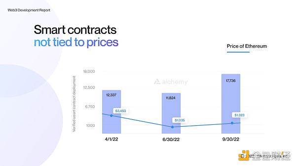 例如,當以太坊的價格在 2022 年第二季度從 3450 美元下跌 70% 至 1035 美元時,由于價格下降的幅度是智能合約部署的 17.5 倍,價格和智能合約的發展并不相關。