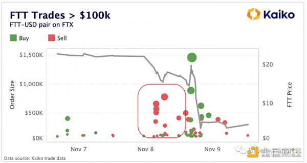 隨著價格的下跌,大量的市場賣出訂單源源不斷。關于 Multicoin Capital 對 FTT 敞口的進一步披露表明,隨著 FTT 跌至 22 美元以下,行業參與者正在迅速平倉 FTT。通常情況下,交易者會將他們的訂單分成更小的部分,以避免下滑,但在絕望的時候,公司會接受他們能得到的任何價格,許多訂單超過 10 萬美元。