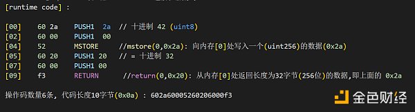 通過分析 圖4 的 whatIsTheMeaningOfLife() 函數調用棧可以得知,讓智能合約返回 “42” ( 十六進制 0x2a) 的關鍵在于 先用 mstore 指令將 0x2a 放入 Memory , 再用 return 指令將內存里的 0x2a 返回即可。至于那些函數名稱和函數簽名,只是高級語言的編譯產物,直接用匯編實現的話,我們直接用這段代碼讀寫內存,完全沒有必要搞那些花里胡哨: