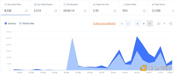 截至 2022 年 10 月 14 日,https://www.xencrypto.io/ 已產生 17.8 萬次訪問,從流量變化趨勢的角度來看,項目正式發售前的首次波峰出現于 9 月 27 日前后,二次波峰出現于 10 月 5 日前后,并在項目正式發布的 10 月 8 日迎來發布后的首次波峰,12 日迎來二次波峰(受 Attack 傳言的影響)。