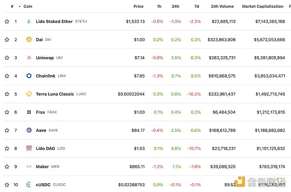 DeFi項目鎖定資產前十排名及鎖倉量 數據來源:defillama