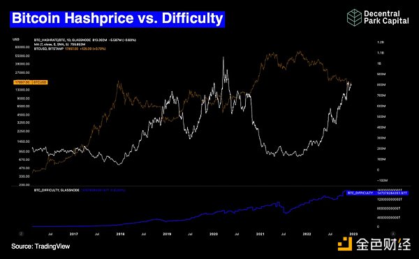 內容:比特幣不斷上漲的哈希價格(哈希率 / 價格)與受抑制的 BTC/USD 比率以及不斷攀升的挖礦難度。