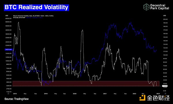 內容:Bitmex 的 7 D BTC 實現波動率指數在 2022 年下半年保持低位。