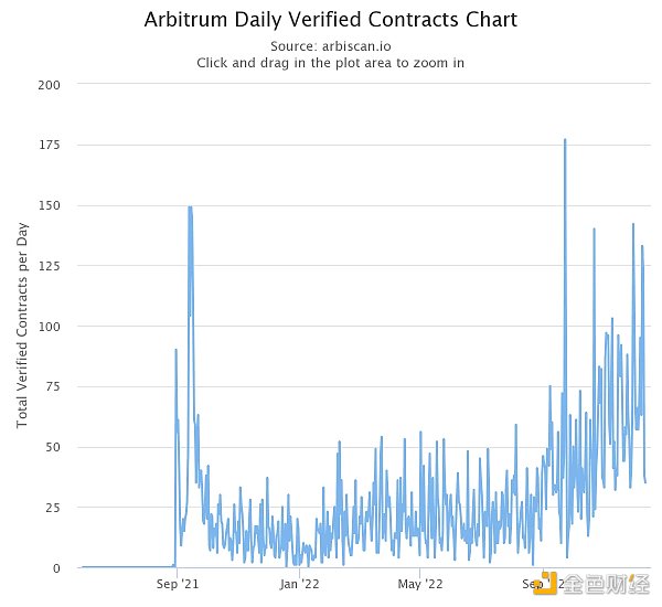 在已部署的驗證合約方面,Arbitrum 最近達到了單日部署 176 份合約的峰值,同時在最近幾個月持續飆升至每日部署超 100 份合約。