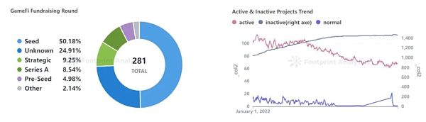從融資總額方面來看,GameFi 受熊市影響程度頗深。2021 年總融資金額到達 48 億美元,而截止目前,今年的融資額度僅為 20 億美元,同比下降了 58%。此外,據 Footprint 對 281 個 GameFi 項目的調查,結果顯示僅有一半的項目完成了種子輪投資,活躍項目的數量呈下降趨勢,大多項目發展前景不容樂觀。