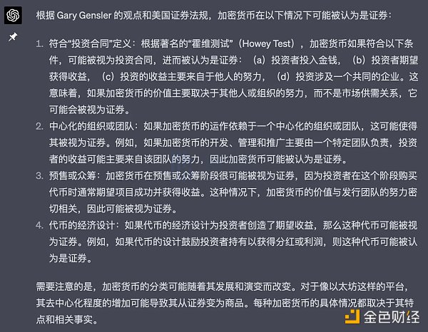 ChatGPT:根據 Gary Gensler 的觀點和美國證券法規,加密貨幣在以下情況下可能被認為是證券: