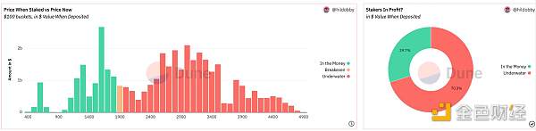 但是對于另外 40%,它們大多是一些以太坊 POS 質押早期參與者,而這一部分人的成本價是相對較低的;以太坊信標鏈主網存款合約地址最早在2020 年11 月推出,當時ETH 價格僅約 $400~$500,直到 2021 年的三月底以太坊代幣才達到今天的價格,因此或許可以猜測這部分質押者占了上圖中“In the Money”的一大部分,而這樣的成本價到今天的 $1800 也有 3~4 倍的漲幅,因此這一部分人可能會帶來一定的拋壓。并且由于市場情緒原因,這一部分人的拋壓可能會使市場產生 FUD情緒,導致60% 的質押者也恐慌拋售,不過上文也有說到,以太坊質押的退出是有限制速率的,因此這些質押者的拋售反應在市場上也是相對緩慢的。