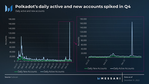 此外,Polkadot 中繼鏈在 2022 年第四季度表現出令人印象深刻的環比增長,可以說是今年最強勁的一個季度。每日活躍賬戶增長 64%,新賬戶增長 49%。激增可能是由于用戶離開 FTX 并尋求更開放、透明和 Decentrilized 的網絡,如 Polkadot、USDT。