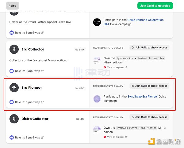 7. Guild 任務中值得注意的是 SyncSwap 目前正在進行的 SyncSwap Era Pioneer 活動,在 4 月 20 日之前完成該任務都可于 Galxe 領取 NFT,并可在 Guild 中領取 Era Pioneer 身份。