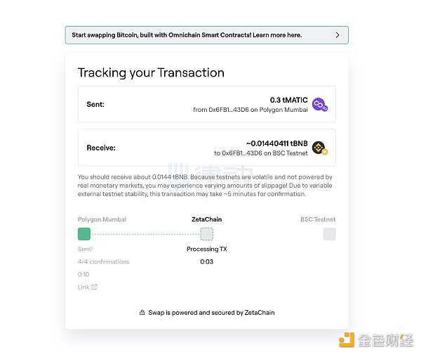 接下來進行 Swap,點擊進入官網,通過 Cross-Chain Swap,選擇從 Goerli 將 ZETA Swap 為 Polygon Mumbai 的 tMATIC,點擊錢包確認;