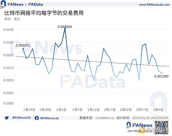 不過,就目前的情況而言,這種影響尚未體現。相反,近期比特幣網絡平均每字節(最小區塊空間單位)的交易費用還呈下降趨勢,從 1 月 21 日的 0.0023 BTC 下降至 3 月 5 日的 0.0013 BTC,降幅約為 41.52% 。并且近期平均每字節交易費用的波動也比較大,最高能達到 0.0031 BTC,最低則只有 0.00099 BTC。