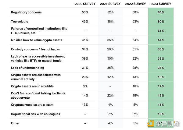 主要的擔憂 -- 監管的不確定性 -- 仍然是一個長期的憂慮來源。65% 的顧問稱這是進一步采用的一個障礙,高于 2021 年(60%)、2020 年(52%)和 2019 年(56%)。然而,一個令人鼓舞的發現是,顧問們對他們的加密知識的信心似乎正在增長。在 2022 年,選擇“缺乏理解”(25%)或“缺乏談論加密貨幣的信心”(16%)為障礙的顧問更少。