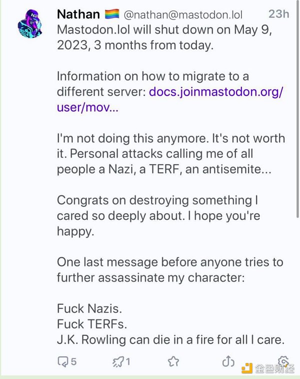 Nostr還實現了脫離聯邦的自由。所有其他的“言論自由”平臺仍然存有中心化的方面。如果你使用的應用程序有自己的“服務條款”,那么你對你的社交媒體就沒有主權。Mastodon用戶歷經艱辛才發現這一點。回到我上文提到的關于運行服務器對人們要求過多的觀點……很少有人能處理好“公共空間”管理員固有的職權濫用問題。