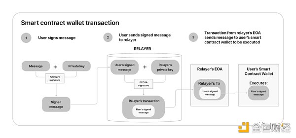 從用戶的角度來看,智能合約錢包可以通過新增EOA的私鑰管理,然后增加幫助gas補貼的中繼器來完成這一切。流程如下圖所示。