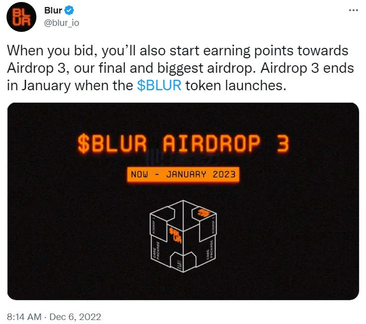 Blur 第三輪空投活動上線12 月 6 日,NFT 市場 Blur 發布公告宣布第二輪空投開放申領。此外將會上線第三輪空投活動,當用戶出價時即可開始賺取 Blur 第三輪空投的積分,這是 Blur 最后一次、也是規模最大的一次空投。