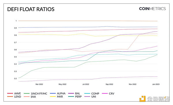 我們還可以考慮從傳統金融市場借用一個衡量這些影響的指標,稱為浮動比率(Float Ratio)。該比率是指可在市場上交易的資產份額,可以幫助人們估計大型資產持有者清算其代幣導致顯著波動和價格波動的潛在未來風險。