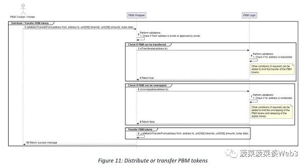 在分發或轉移階段,PBM代幣以封裝形式被轉移。這兩個階段唯一的區別是涉及的角色。圖11說明了涉及的步驟。