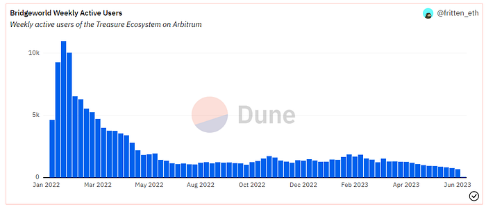 該協議于2021年10月從以太坊遷移到二層網絡,并在2021年11月份正式推出Treasure DAO,Treasure圍繞為MAGIC賦能而構建,開啟了其作為鏈游平臺的敘事,曾被稱為加密世界“任天堂”。作為GameFi頭部項目,其至今生態發展如何?