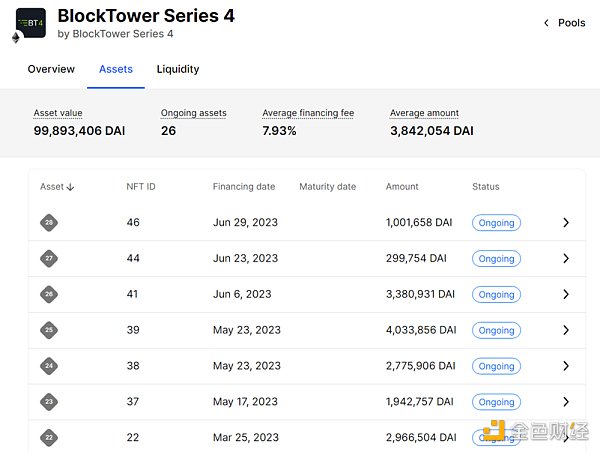 圖十一:Centrifuge BlockTower series 4部分資產,來源:Centrifuge圖為Centrifuge App頁面,其中BlockTower Series 4的截圖,下方列表為作為鏈上抵押品的NFT,每個NFT對應一筆由資產發起方驗證過的鏈下現實資產,在該案例中為結構化信貸。